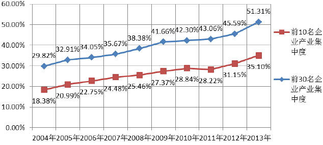 近年来,我国造纸行业龙头企业一方面通过引进国外先进技术和装备,提高了行业整体技术水平和生产能力,生产规模不断扩大,一方面在全国范围内进行跨地区兼并整合,造纸企业向集团化和规模化方向发展,行业集中度持续提升。2004年至2013年间,我国纸和纸板年产100万吨以上的企业从3家增加到15家,其中排名第一的玖龙纸业(控股)有限公司的年产量达到了1,109万吨;产业集中度上,行业前10名造纸企业的产量占同期全国产量的比重已从18.38%增至35.10%,行业前30位的企业产量占同期全国产量比重由29.32%增加至51.31%。