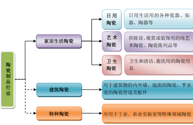 陶瓷行业主要分为日用陶瓷、卫生陶瓷、艺术陶瓷、建筑陶瓷以及特种陶瓷几个细分行业,其中日用陶瓷、卫生陶瓷、艺术陶瓷因为与家居生活密切相关,又常被归类为家居生活陶瓷。陶瓷制品行业的细分行业如下图所示: