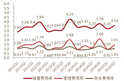 珠宝行业单季度毛利率经过去年四季度短暂下滑后已回升至10.93%。剔除上半年三费费率低于下半年季节性因素影响,上半年珠宝行业三费水平均有所上升,2013年以来黄金等贵金属价格持续下行,珠宝行业上市公司成本端压力对业绩带来一定负面影响。