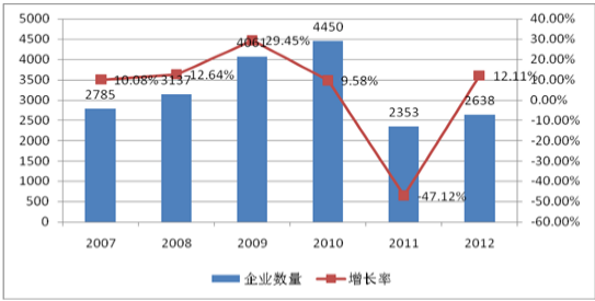 2007-2012年我国不干胶印刷行业企业数量增长趋势