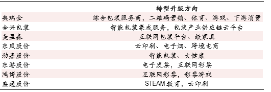 模式升级和新兴行业是转型主要方向。在行业景气度下滑的压力下,包装印刷企业纷纷有了转型升级的方案。其中部分围绕主业做模式升级和产业链延伸,如奥瑞金转型综合包装服务商,围绕消费品客户服务向新兴行业外延,劲嘉股份开拓智能包装业务等。另有企业直接开辟第二主业,如盛通股份转型STEAM教育等。