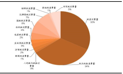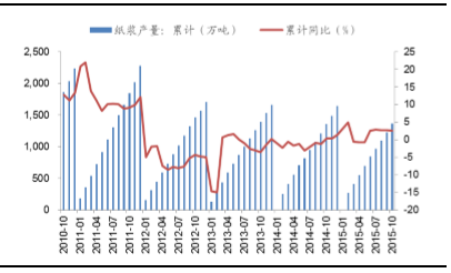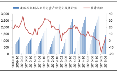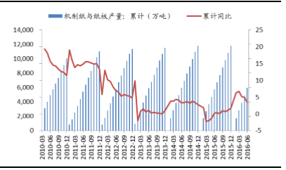 2016年1-6月份,机制纸与纸板产量为5967.6万吨,同比上涨3.4%,2015年1-10月份,国内纸浆产量1364.09万吨,同比上涨2.62%。2015年行业消费量结构为:新闻纸299万吨、涂布纸642万吨,生活用纸817万吨,包装纸681万吨,白纸板1299万吨,箱板纸2297万吨,瓦楞原纸2228万吨,特种纸217万吨,其他纸192万吨,书写纸1680万吨。2016年1-6月份行业固定资产投资1416.47亿元,同比增长5.4%。