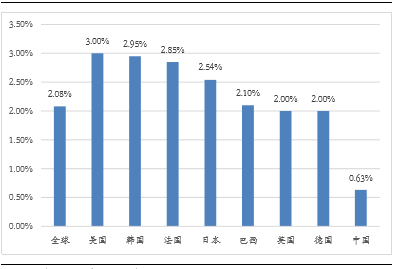各国体育年增加值占GDP比较(2013年)