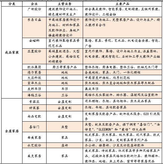 成品家装、全屋家居上市及部分拟上市代表公司主营业务及产品