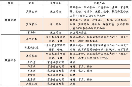 软装宅配环节产品具有快消品性质,更新换代速度相对更快。相关A股市场上市公司以罗莱生活、梦洁家纺、富安娜等床品生产企业为主,其他饰品、画品、收藏品等产品A股上市公司暂无对应标的。服务平台包括居然之家、红星美凯龙、集美家居等连锁经营家居卖场以及土巴兔、齐家网、美乐乐、我爱我家网、星易家、家装e站等家居垂直电商平台。