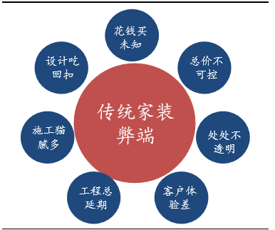 传统家装产业痛点可总结为“七宗罪”:花钱买未知、设计吃回扣、施工猫腻多、工程总延期、客户体验差、处处不透明、总价不可控。家居行业是典型的低关注度、高参与度行业,除了对装修有实际需求的阶段,消费者对家装家居产品品牌属性不熟悉,并且由于行业过于分散,并未建立统一标准的行业准则,消费者参与到施工过程中费时费力。