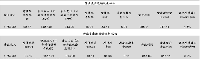 中为分别测算了营业支出全抵扣与营业税金抵扣40%两种情形下,营改增对券商业绩的影响: