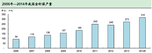 2013年我国金针菇产量达273万吨,与2006年94万吨相比,增长近三倍。以2006-2013年年均增长率16%计算,2014年我国金针菇产量约为318万吨。按我国十二五规划预计的国内生产总值平均增速7%保守估计,到2020年,我国金针菇产量将达到438.22万吨。2006年—2014年我国金针菇产量单位:万吨