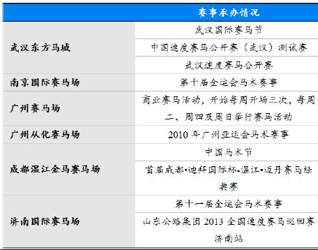武汉东方马城:“赛马之都”踌躇满志。东方马城位于湖北省武汉市郊的东西湖区,于2003年正式投入使用,为香港东方神马集团控股的东方神马实业(武汉)有限公司运营。东方马城的核心项目是按国际标准建造的国际赛马场,赛马场外圈是沙地跑道,内圈是草地跑道,硬件设施齐全。东方马城承办了多场国内重要赛事,并在2011年7月获批武汉速度赛马公开赛。素有“赛马之都”之称的武汉踌躇满志,从未间断过在政策允许范围内针对开设马彩的试水,但未曾实现实质性突破。武汉赛马场运营模式