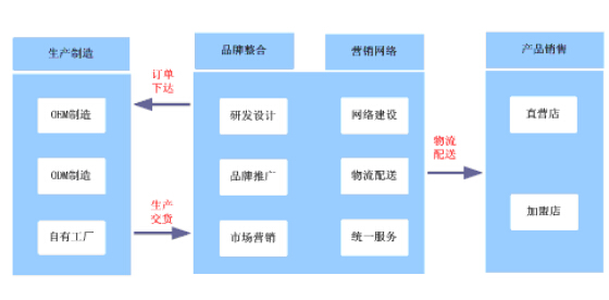 在该模式中,户外用品企业以集成化的运作模式为主要特征,即:采取全部外包或者部分外包的生产模式,自有配送和物流外包相结合的物流模式,以及加盟店与直营店相结合的销售模式,以争夺产业链的有利地位,并以获得品牌附加值的最大化为目标。目前国际及国内知名户外用品企业基本选择该种经营模式,具体运作流程如下: