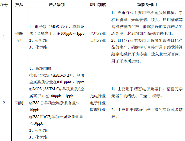 化学试剂包含各种中高纯度等级的专用化学品,主要应用于分析测试、教学、科研开发以及新兴技术领域。近年来随着国家产业升级和产业结构调整,电子、光学、航空航天、新材料、生物医药等先进制造业快速发展,工业等级的化工原料品质已远远不能满足这些新兴领域与行业发展的需求。由于化学试剂的主要特点是产品纯度高于通常的化工原料,且具有较强的应用针对性和技术性,新兴领域的技术需求就为化学试剂行业的发展带来了新的市场。目前化学试剂主要的业务市场已转为上述先进制造业生产所需要的高纯度的功能材料与原料。以硝酸钾、丙酮两个试剂产品为例,其具体应用介绍如下: