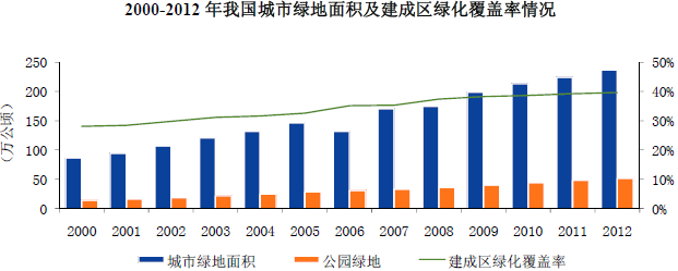 根据国家统计局网站的统计数据,2012年,我国城市绿地面积为236.78万公顷,较2000年的86.53万公顷大幅增长;公园绿地面积从2000年的14.31万公顷增长到2012年的51.78万公顷,年均复合增长率为11.31%;人均公园绿地面积从2000年的3.70平方米增长到2012年的12.26平方米,年均复合增长率为10.50%。2000年-2012年我国城市绿地面积如下图所示:2000-2012年我国城市绿地面积及建成区绿化覆盖率情况