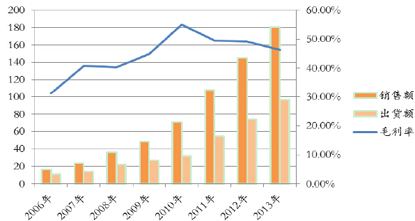 户外用品零售商的整体毛利率水平在30%~45%之间。根据COCA统计,自2006年以来全行业的毛利率逐年提升,预计未来行业平均毛利率还将稳中有升。由于价格体系对供货商至关重要,预计行业惯例会继续维持,行业整体利润水平不会发生较大变动。近五年行业毛利率的变动情况如下图所示: