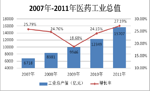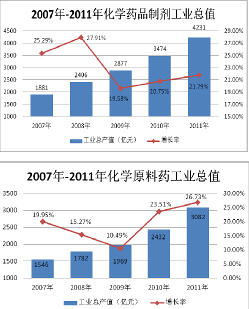 国家食品药品监督管理总局下属南方医药经济研究所发布的《2012年度中国医药市场发展蓝皮书》显示:2007-2011年,我国医药工业(包括化学原料药、化学药品制剂、生物制剂、医疗器械、卫生材料、中成药、中药饮片等7大子行业)总产值保持快速增长,从2007年的6,718亿元增长到2011年的15,707亿元,年均复合增长率为23.66%。其中:化学药品制剂工业总产值保持较快速度增长,从2007年的1,881亿元增长到2011年的4,231亿元,年均复合增长率22.47%;化学原料药工业总产值从2007年的1,546亿元增长到2011年的3,082亿,年均复合增长率18.82%。