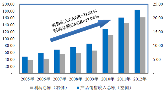 20世纪 90年代以来,随着我国药品 GMP认证的颁布实施,制药装备行业快速发展,制药设备企业数量以及产品种类迅速增加,行业整体经济效益显著提高。根据中国制药装备行业协会 2013年的统计数据显示,截至 2012年底我国制药设备制造企业已有近千家,277家会员单位 2012年销售收入合计约 183.73亿元,较 2011年增长 16.28%,利润总额为 20.27亿元。但与国外同行业领先企业相比,国内制药设备生产企业产值仍偏低,抗风险能力较弱,277家会员单位平均销售收入仅为 0.66亿元。总的来说,我国制药装备行业尚处于初步发展阶段。中国制药装备行业协会会员 2005年-2012年销售收入统计单位:亿元