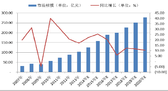 步进电机广泛应用在各种自动控制系统中,下游产业包括数控机床、工业自动化、办公自动化、印刷设备和家用电器等领域,步进电机制造行业的发展受制于下游行业的拉动。根据中为咨询的预测,2015-2020年,我国步进电机的需求量将保持增长态势,2015年,行业将可能出现新一轮的高速发展期,其中,工业自动化领域,到2015增速将达到30%,办公自动领域,增速在20%以内,印刷设备制造领域,增速在30~50%之间,家用电器制造领域,增速在10%以内。2015-2020年,我国步进电机制造市场规模将保持15%的年平均增长速度。图:2007-2020中国步进电机制造行业市场规模发展趋势图