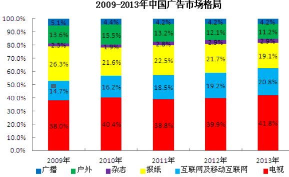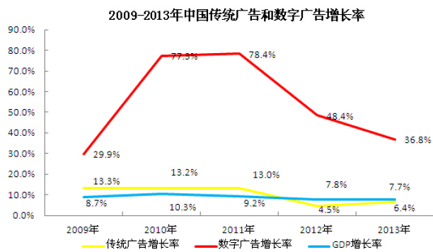 近年来,随着互联网及移动互联网应用的普及率提升,微博、微信、视频、SNS等新型传播方式频现,电子商务发展日趋成熟,品牌主的传播和销售可以同时在互联网(包括移动互联网)实现,销售又为品牌主的传播提供了内容和口碑,数字营销传播呈现“传播即营销、营销即传播”的特征,数字营销传播在品牌主营销传播中的地位持续提升,数字营销广告收入(包括互联网及移动互联网)占中国广告市场的份额由2005年的4.80%上升到2013年的20.80%,已经超越报纸、杂志和户外成为仅次于电视的第二大媒体。