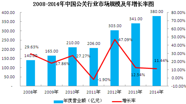 作为国家全力鼓励支持发展的现代化服务业的重要组成部分,近年来随着全球经济转暖和我国经济快速增长,我国公关行业表现出良好的增长势头,市场规模不断扩大。根据中国国际公共关系协会的调查数据显示,2014年我国公关行业保持稳定增长,整个市场的年营业规模约为380亿元人民币,年增长率为11.44%左右,比2013年12.54%的增速略有下降。