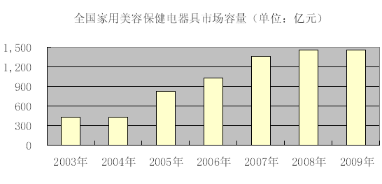 除保健食品外,包括保健桑拿设备、按摩器具等保健器具在内的保健用品等领域也呈快速发展态势。国家统计局数据显示,2003-2009年,我国家用美容保健电器具市场容量从424亿元增至1,461.71亿元,年复合增长率达22.91%;城镇居民家庭平均每百户拥有健身器材4-5套。全国家用美容保健电器具市场容量(单位:亿元)