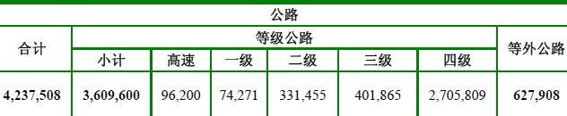②公路等交通基础设施不断完善。截至2012年底,我国公路总里程为423.75万公里,其中等级公路为360.96万公里。2013年,交通运输部制定《国家公路网规划(2013年-2030年)》,国家公路网规划总规模40.1万公里,由普通国道和国家高速公路两个路网层次构成。其中,普通国道网由12条首都放射线、47条北南纵线、60条东西横线和81条联络线组成,总规模约26.5万公里。国家高速公路网由7条首都放射线、11条北南纵线、18条东西横线,以及地区环线、并行线、联络线等组成,约11.8万公里,另规划远期展望线约1.8万公里。截至2012年底我国公路总里程及其构成情况如下: