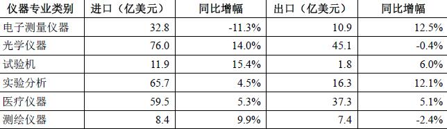 此外,仪器仪表一直是机械行业门类下进出口贸易逆差较大的行业。2014年仪器仪表行业进出口总额达600亿美元,其中进口348亿美元,出口252亿美元,存在较大的贸易逆差。下表为2014年仪器仪表重点行业进出口基本情况表: