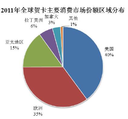 全球贺卡消费市场主要集中在欧美等发达国家和地区。以2011年为例,美国贺卡消费市场占全球市场总额的39.85%,欧洲地区贺卡消费市场占全球市场总额的35.07%,具体情况如下: