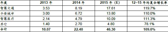 交通、安防、医疗引领智慧城市大数据应用。在智慧城市的各细分领域中,目前大数据应用渗透率比较高、市场规模比较大的主要集中交通、安防、医疗等民生领域。根据中为咨询数据,2015年,智慧交通、平安城市、智慧医疗三个领域中大数据应用的市场规模有望达到17.6亿元、13.8亿元、10.1亿元,2013年至2015年的年均复合增速有望达到120%、110%、111%。数据应用在智慧城市各细分领域的市场规模(亿元)