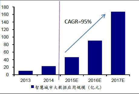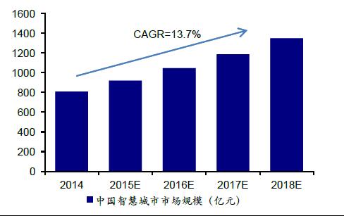 智慧城市进入大数据运营阶段。智慧城市大数据运营时代的到来有其发展的必然性。(1)在智慧城市的底层架构布局的是多样化的智能终端设备,设备采集、积累的数据为智慧城市的大数据运营提供了基础和支持。(2)智慧城市中更加强调交互和万物互联(物联网),跨行业、跨领域、跨部门的数据实时进行交互。根据中为咨询数据,2014年中国智慧城市IT投资总规模达到807.9亿元,2018年的市场规模将达到1347.9亿元,未来四年的年均复合增速为13.7%;在中国智慧城市大数据应用市场,2014年的市场规模为22.4亿元,未来三年的年复合增速将高达95.0%,2017年的市场规模有望达到167亿元。智慧城市IT投资规模