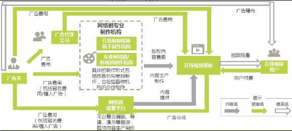 与传统电视剧市场相比,网络剧市场的盈利模式也更加多元化。除二者兼备的传统营销外,还丰富了内容营销渠道,包括剧集冠名、植入广告、定制剧等形式,随着版权市场规范落地,用户付费习惯养成,会员收入和在线打赏也成为网络剧的盈利模式之一。网络剧产业链简图