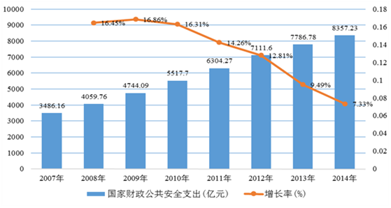 近年来,我国公共安全问题频繁爆发,安全生产、公共卫生、环境保护工作面临较大挑战,推动了公共安全监测管理体系市场需求快速增长。根据国家统计局的数据,国家财政在公共安全领域的支出逐年增加,由2007年的3,486.16亿元增加到2014年的8,357.23万元,年复合增长率为13.30%。未来随着物联网和信息化技术的发展,以及国家财政投入规模的扩大,预计2015年至2017年,国家财政公共安全支出将达到约9,400亿元至12,000亿元。