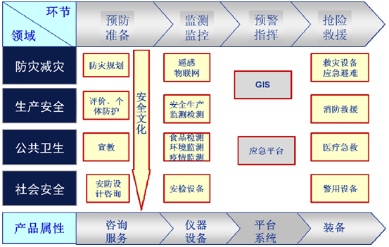 根据产品面向的突发事件类型不同,公共安全行业可以细分到防灾减灾、生产安全、消防、公共卫生、社会治安等领域。根据公共安全突发事件应对的过程,可以分为以下4个环节:(1)预防准备,包括防灾规划、教育培训体系、个体防护、物资储备保障与安全评价、设计咨询服务等。(2)监测监控,包括卫星遥感、航空航天技术等高新技术、环境监测、高科技检测设备与试剂、安防监控等。(3)预警指挥,是指事件发生时以及发生后对态势的预警和后台的指挥所需的平台系统。(4)抢险救援,是指对各类突发事件应急处置装备的生产和维护,包括对公众的救护避难装备、控制事件蔓延的救援装备、减少事件损失的装备等。安全产业产业构成示意图