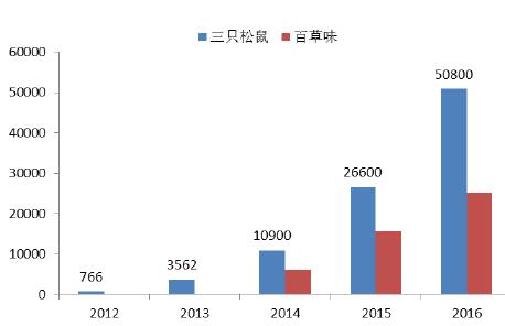 双十一符合预期,明年行业增长仍然值得期待,强者恒强格局清晰。零食电商最近几年跑马圈地,快速增长,迎合年轻消费群体休闲化的趋势,经过14-15年两年翻倍增长,16年仍然保持,双十一三只松鼠实现5亿的既定目标,相比去年翻倍,百草味增速也超过50%,预计三只松鼠在去年25亿的收入体量基础上仍有翻倍。由于品类的多元化、消费群体扩容,持续烧钱后部分企业退出,电商跑马圈地进入后半程,龙头行业集中度加速提升,在16年较大的基数下,增速整体会有所放缓,但是仍有望保持50%增速,行业的竞争格局更加清晰。主要电商平台收入变化(亿)