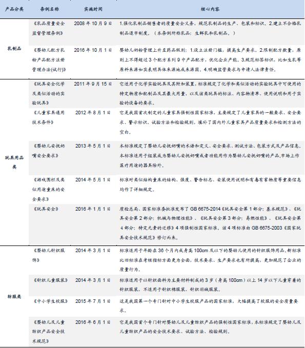 长期以来,我国婴童产品市场集中度低,并且并没有完善的行业标准。因此导致婴童消费的质量也良莠不齐。但是婴童产品的最终消费群体是婴童,许多产品都会直接接触婴童。参差不齐的质量不仅影响行业的健康发展,也会影响婴童的身体健康。因此,政府也在逐步加大对婴童行业的监管力度。特别是近三年,政府各相关部委针对婴童行业中的多个子行业,都陆续发布了更加严格和规范的行业质量标准。我们对近几年颁布的主要行业监管政策进行了如下梳理,同时相信随着国家对婴童行业关注度的日益提高,还会有更多更加完善的监管细则在日后出台。