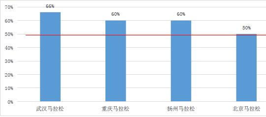 观赛型体育旅游和参与型体育旅游构成体育旅游细分领域的主体,其中观赛型体育旅游的占比大约15%,而参与型体育旅游的占比在70%。以马拉松赛事为代表的路跑经济的发展是全民健身运动火速前行的突出表现,全民健身运动的推进会更加刺激参与型体育旅游市场。通常来讲,马拉松参赛选手会提前和推迟离开参赛地点,诸如北京、上海、杭州、厦门、兰州等地的马拉松赛事,能够有效提升当地旅游经济。各地马拉松赛事异地参赛者比例