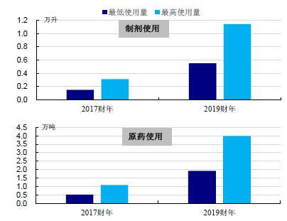 孟山都公司计划2017年投放1500万英亩RoundupReady2Xtend大豆(2016年种植量仅100余万英亩)和300万英亩BolIgard11XtendFlex棉花。如果仅考虑孟山都RoundupReady2Xtend大豆美国种植推广计划(图52),根据孟山都披露的XtendiMax麦草畏制剂基本信息(表7;根据“用量”的上下限,且假设每年使用3次),据我们测算,2017财年RoundupReady2Xtend大豆种植将带动麦草畏原药新增需求约5246~10899吨,2019财年为约1.9~4.0万吨(原药用量是根据表7中“制剂规格”折算)。XtendiMax麦草畏制剂基本信息