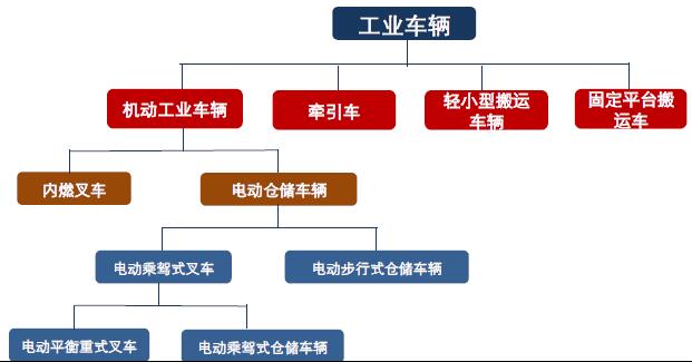 按照中国工程机械协会工业车辆分会分类标准,工业车辆行业可分为机动工业车辆(叉车)、轻小型搬运车辆、牵引车和固定平台搬运车四个细分子板块,其中以机动工业车辆和轻小型搬运车辆为主。工业车辆产品分类结构图