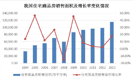 2004年我国住宅商品房年销售面积为33,819.89万平方米,2010年增长至93,376.60万平方米,年均复合增长率为18.44%。2010年以来,受房地产调控政策的影响,2011年和2012年住宅商品房销售面积增速放缓。2013年,我国商品房住宅销售面积较2012年增长了17.52%,增长速度快速回升。从长期来看,随着我国城市化进程的持续推进,住宅商品房销售规模还将保持一定的增长。