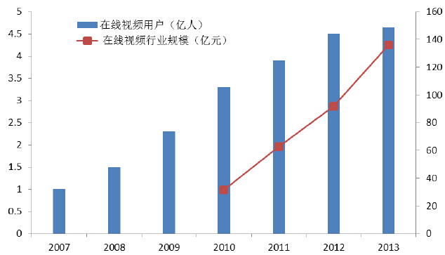 随着互联网、移动互联网等新媒体的迅速兴起,受众的媒介消费习惯也发生了巨大变化,以视频网站、移动互联网视频APP为代表的视频播出平台的整体影响力不断增强,受众规模快速提升,市场规模迅速扩大。根据艾瑞咨询《2011至2012年中国在线视频行业年度监测报告》及《2014年中国在线视频行业年度监测报告》显示,我国互联网视频用户规模从2007年的约1亿人增长至2013年的4.64亿人,年均复合增长率约为29.1%。中国在线视频行业的规模也从2010年的31.4亿元增长到2013年的135.9亿元,年均复合增长率达到63.0%。