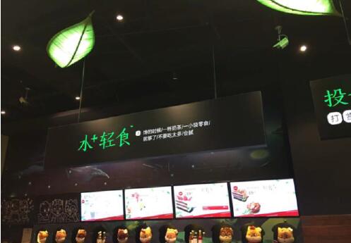 .设立“水+轻食”休闲区,突出体验店定制化、个性化亮点。店铺内有1/3的面积设有座椅和吧台,在“水+轻食”休闲区,顾客可以消费奶茶、咖啡、甜品等食品。店内休息区内设有舞台、音响、书架等配备设施,在周末将会在舞台上举办舞会或者cosplay活动,日常店内播放的背景音乐也是具有浓郁的二次元风格,可以说整家投食体验店就是一个专门为90后定制的休闲娱乐场所,预计将吸引大量8090后群体进店体验和消费。三只松鼠“水+轻食”休闲吧台