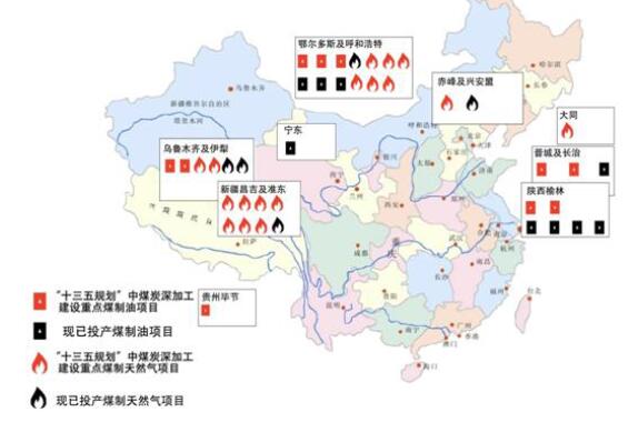 2015年,我国煤制油产能达寽278万吨,产量132万吨;煤(甲醇)制烯烃产能达寽792万吨,产量648万吨;煤制乙二醇产能达寽212万吨,产量102万吨;煤制天然气产能达寽31亿立方米,产量16亿立方米;煤制甲醇产能6072万吨。截至2016年,我国已建成煤制油产能740万吨/年、煤制天然气产能51亿立方米/年、煤制乙二醇产能450万吨/年、煤制烯烃1199.2万吨/年、煤制甲醇6072万吨/年;《现代煤化工“十三五”发展指南》指出,预计寽2020年,将形成煤制油产能1200万吨/年,煤制天然气产能200亿立方米/年,煤制烯烃产能1600万吨/年,煤制芳烃产能100万吨/年,煤制乙二醇产能600~800万吨/年,煤制甲醇产能7628万吨/年。中国现已投产及“十三五规划”重点煤制油、煤制气项目分布