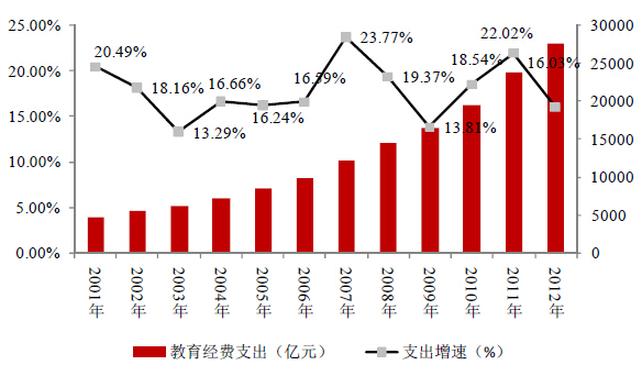 国家对教育事业的持续投入将直接提高接受教育人口的数量及现有国民的文化水平,从而为国内文具行业快速发展持续注入新的动力。2001 年至2012年十二年间,国家每年的教育经费支出基本保持超过国内GDP 增速的两位数增长态势,支出由2001 年的4,637.66 亿元增长至2012 年27,695.97 亿元,占GDP 比例由2001 年的3.18%上升至2012 年的4.28%。2001 年-2012 年政府教育经费支出情况