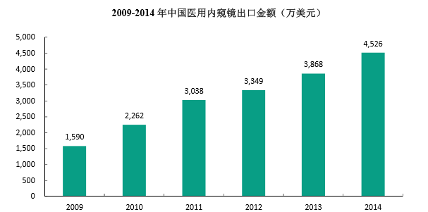 通过技术引进吸收和自主研发,国产企业医用内窥镜产品质量与国际先进企业的差距正在缩小。目前,我国医用内窥镜已摆脱单纯依赖进口的局面,国产内窥镜也实现了出口,并保持高速增长势头。2014年,中国内窥镜出口量达4,526万美元,近5年年均复合增长率7达23%。出口市场相对国内市场对产品的选择上更加理性,对高端品牌的粘性相对不强,中国出口的技术质量过硬、性价比高的产品受到国际市场欢迎。