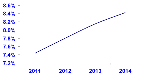 2011-2014年美国其他服务消费量占总消费比