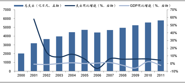 2000-2011年间,介护保险总支出持续快速增长,从2000年的2019亿日元增长到了2011年的5787亿日元。除2006年以外,各年增速均显著高于同期GDP增速。