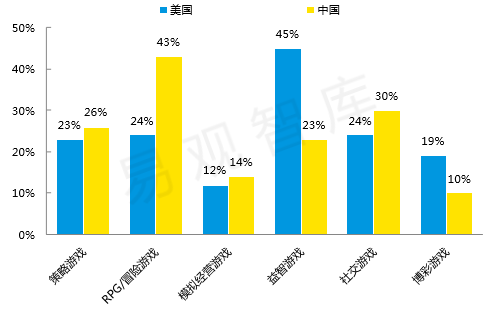 与中国手游玩家相比,美国手游玩家对益智类游戏的偏好远远高于中国玩家。此外,美国玩家对博彩游戏的偏好程度也超过中国,但在RPG/冒险类游戏上的兴趣小于中国玩家。