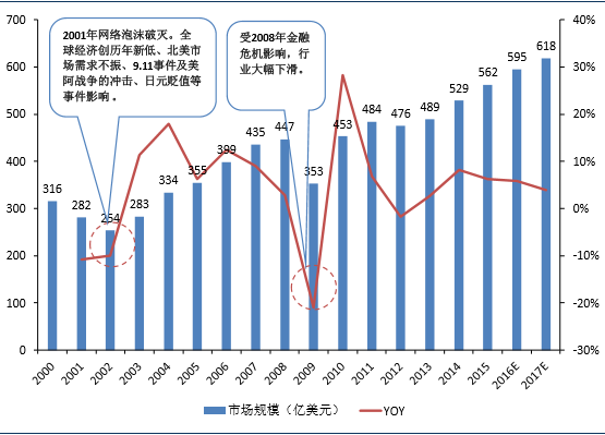 2001年网络泡沫破灭,随着全球经济成长率创历年新低、北美需求市场不振、9.11事件及美阿战争的冲击、日圆贬值等事件影响,连续两年下滑;