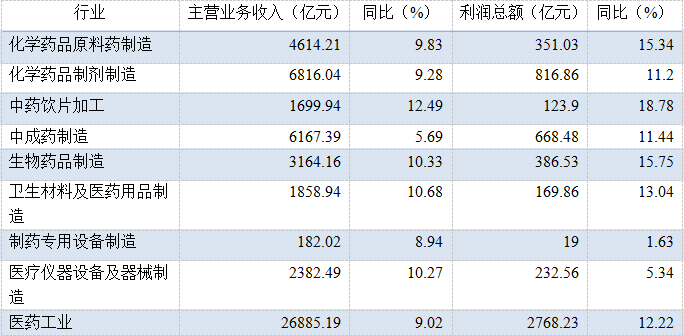 根据工信部消费品工业司2016年7月发布的医药工业统计数据显示,2015年医药工业规模以上企业实现主营业务收入26885.19亿元,同比增长9.02%,实现利润总额2768.23亿元,同比增长12.22%。全年利润增速高于主营业务收入增速,显示医药工业盈利水平有所提升。