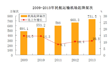 2013 年,全国民航机场完成起降架次731.54 万架次,比上年增长10.8%。