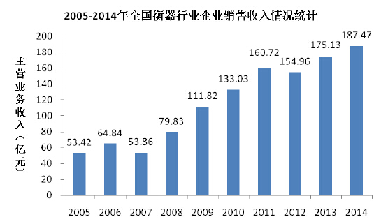 据国家统计局对国内规模以上衡器制造企业经营数据统计结果显示,过去10年间,行业年销售收入由2005年度的53.42亿元增长至2014年度的187.47亿元,年复合增长率达14.97%,远高于同期GDP增长水平。