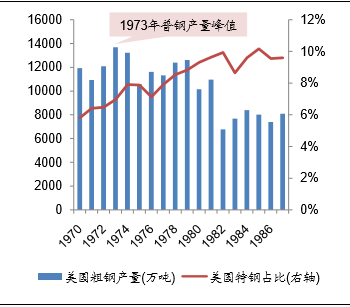 1970-1987年美国的特钢产量占比在普钢产量达峰值后整体呈上升趋势